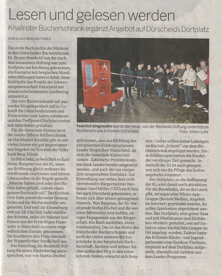 Herrn Dr. Jürgen Rembold, sowie der IG Dürscheid, ist es uns gelungen, ein weiteres Angebot für die Bewohnerinnen und Bewohner von Dürscheid zu schaffen.
