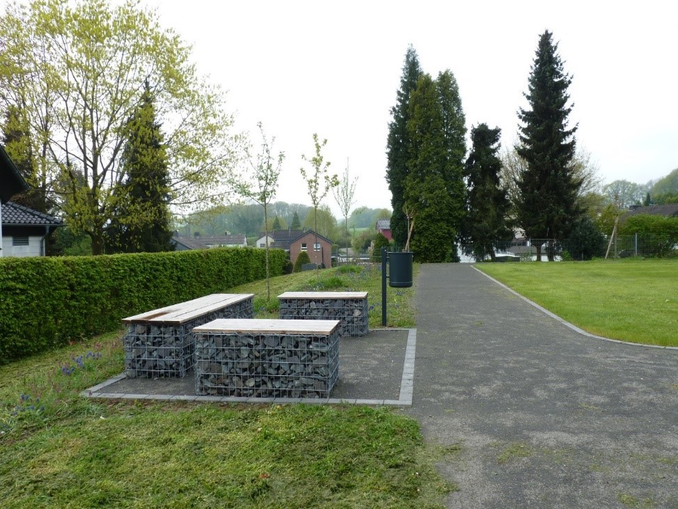 Die große Wiese lädt zum Spielen ein, vier Bänke und eine Sitzgruppe zum Verweilen.